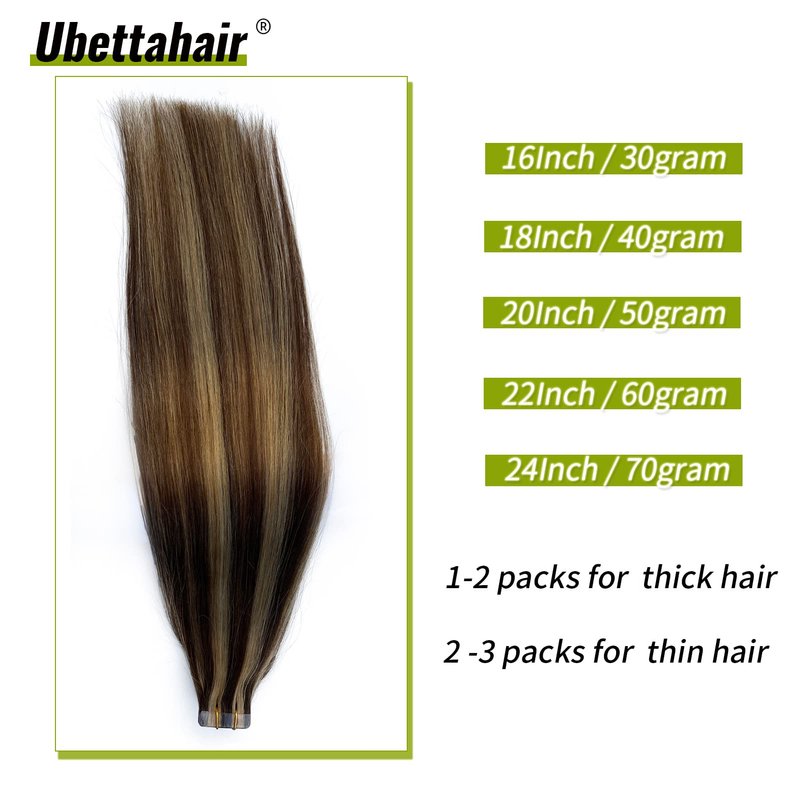 - 【Color Hair Extensions Tape ins】----Balayage ombre highlights hair extensions tape in, many colored hair extensions available for you to choose, to match your own hair color . 16 Inch/30gram;18 Inch/40gram; 20Inch/50gram; 22 Inch/60gram; 22 Inch/70gram. Easy to get a desired hair length and hair volume by adding the tape in hair extensions. Getting the highlights hair extensions soon by choosing the similar colored hair extensions as your rooted hair.