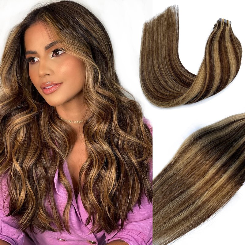Real Hair Extensions Tape in Chocolate Brown to Caramel Blonde Highlights Human Hair Extensions20 Pieces 22 Inch 60 gram Skin Weft Hair Extensions Seamless Silk Remy Hair Tape on Extensions