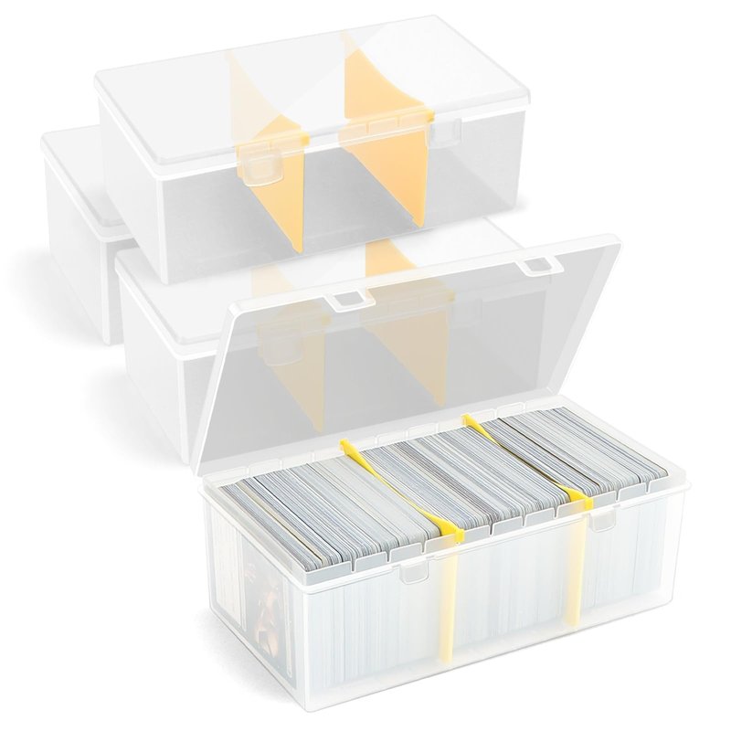 - Clear Trading Card Storage Boxes: You will receive 4 card storage boxes, each capable of holding 600+ unsleeved cards / 350+ single-sleeved cards / 300+ double-sleeved cards. Note: Not compatible with toploaders or hard cases such as magnetic card holders.