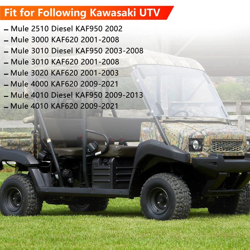 - 【Fitment】Fit for Following Kawasaki UTV ▶ Mule 2510 Diesel KAF950 2002 ▶ Mule 3000 KAF620 2001-2008 ▶ Mule 3010 Diesel KAF950 2003-2008 ▶ Mule 3010 KAF620 2001-2008 ▶ Mule 3020 KAF620 2001-2003 ▶ Mule 4000 KAF620 2009-2021 ▶ Mule 4010 Diesel KAF950 2009-2013 ▶ Mule 4010 KAF620 2009-2021