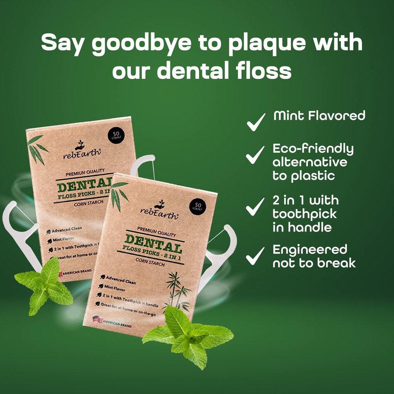 rebEarth Natural Dental Floss Picks - Oral Care Dental Pick w/Mint Flavored Toothpicks, 2-in-1 Natural Floss & Toothpicks, Plant-Based Dental Flossers, Tooth Floss Picks w/Tongue Cleaner (200 Count)