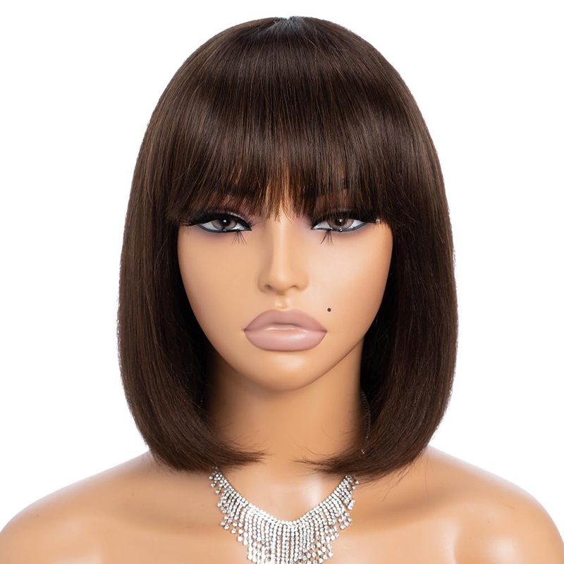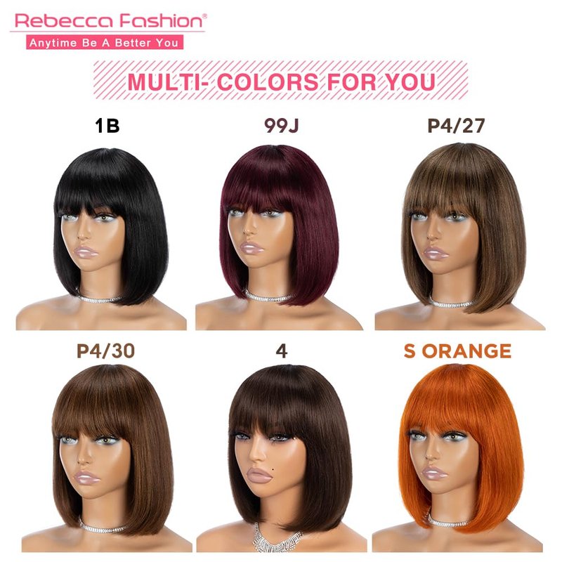 Rebecca Fashion Brown Bob Wig with Bangs Human Hair 10 Inch Light Yaki Straight Short Bob Human Hair Wigs for Black Women Wear and Go Glueless Wig for Daily Wear