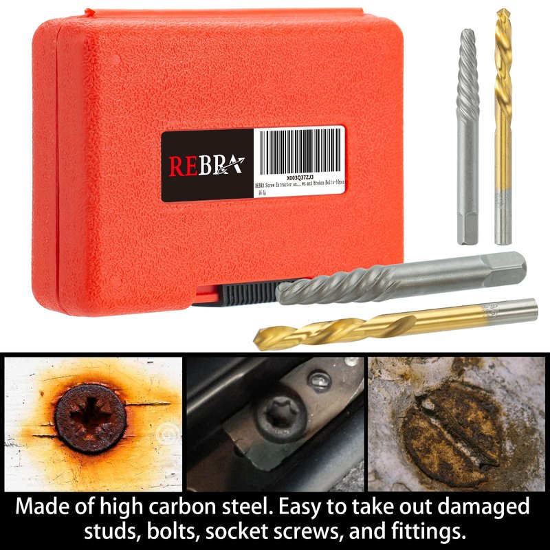 REBRA Screw Extractor and Left-Hand Drill Bit Set, Easy Out Broken Bolt Remover Reverse Cobalt HSS Steel Drill Kit, Ez Out Stripped, Rounded-Off, Damaged Bolts, Screws&Studs Removal Tool 10-Pieces