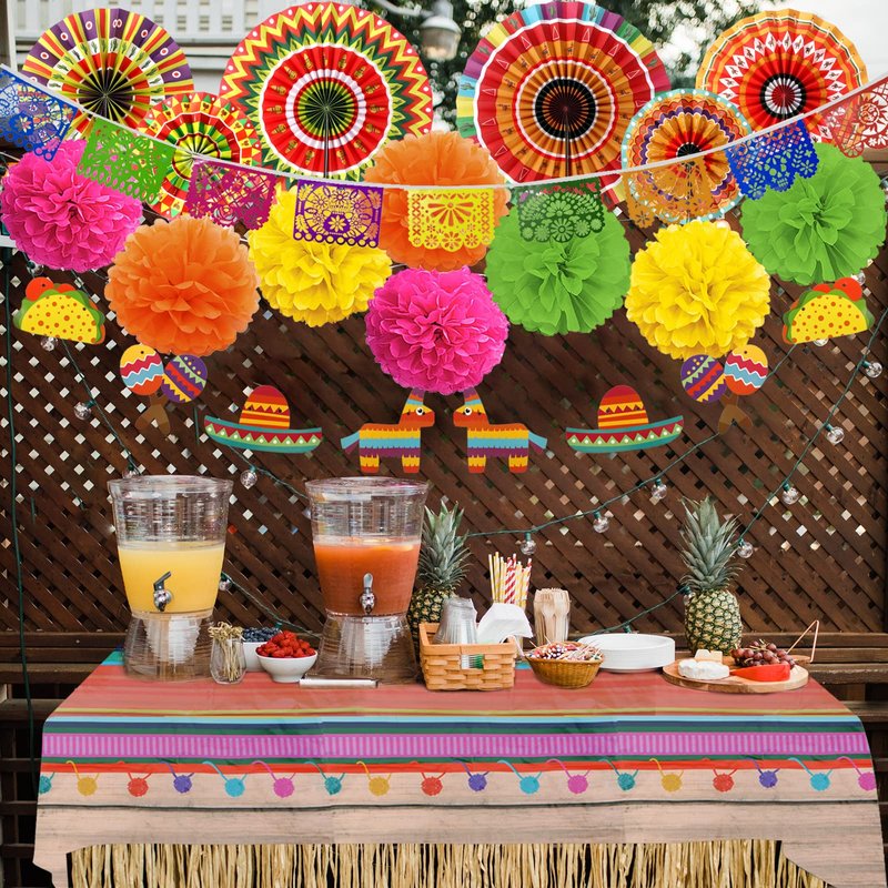 - 【Fun For Fiesta Party】1 x Mexican Tablecloth, 6 x Mexican Paper Fans, 8 x Paper Pompoms, 1 x Mexicano Papel Picado Banner, 1 x Fiesta Banner.( Color: Multi-colored )