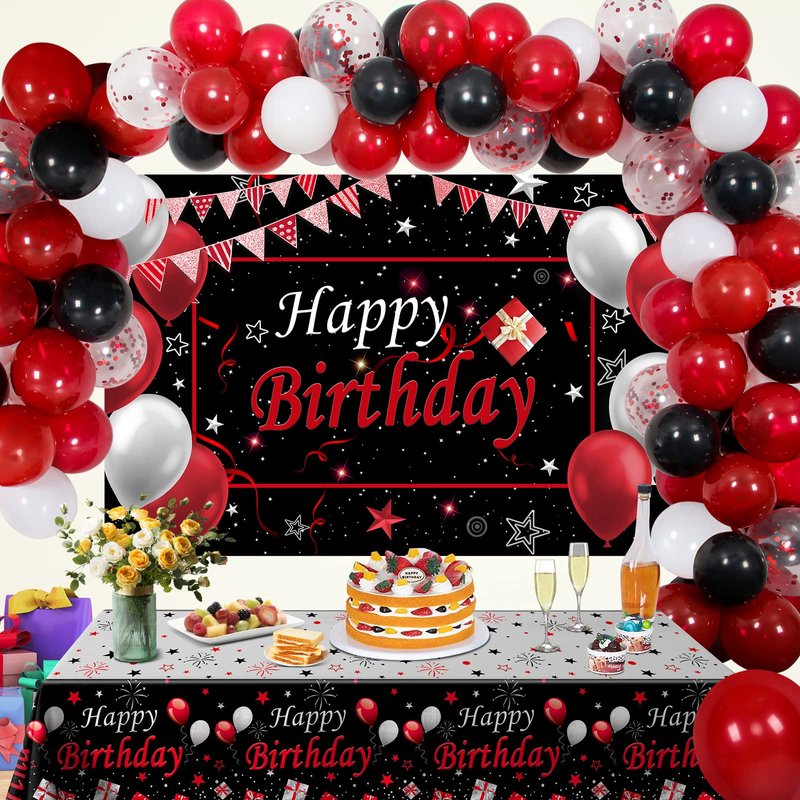 - 🎉Birthday decorations for Men & Women: The party supplies included happy birthday backdrop banner(59"*39.37"), happy birthday table cover(70.86"*42.51"), 25pcs red latex balloons(10"), 15pcs black latex balloons(10"), 5pcs white latex balloons(10"),10pcs red confetti balloons(12"), 1 pack black Foil Fringe Curtains, 10 meters ribbon and a straw.