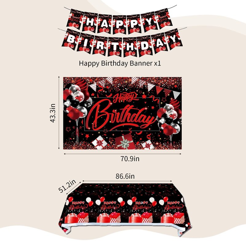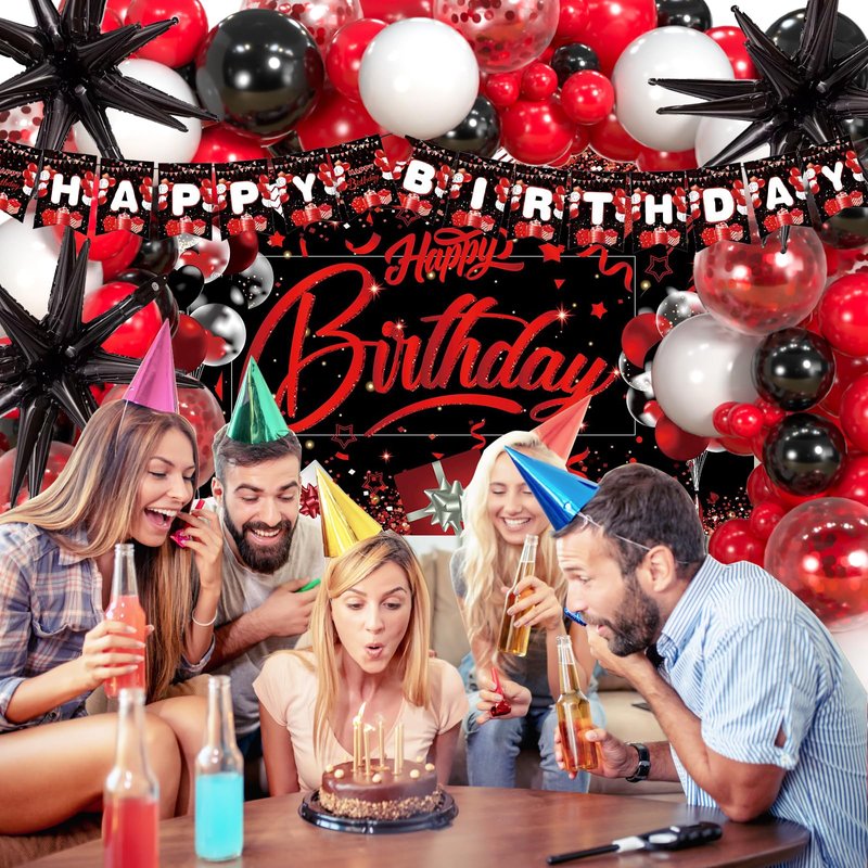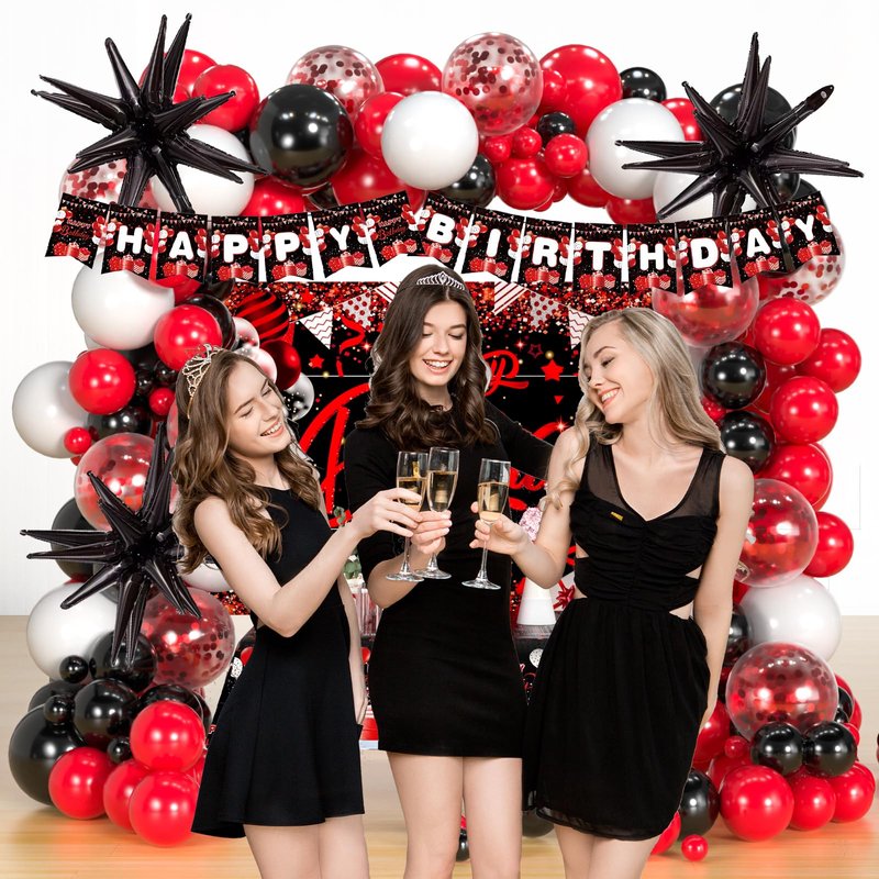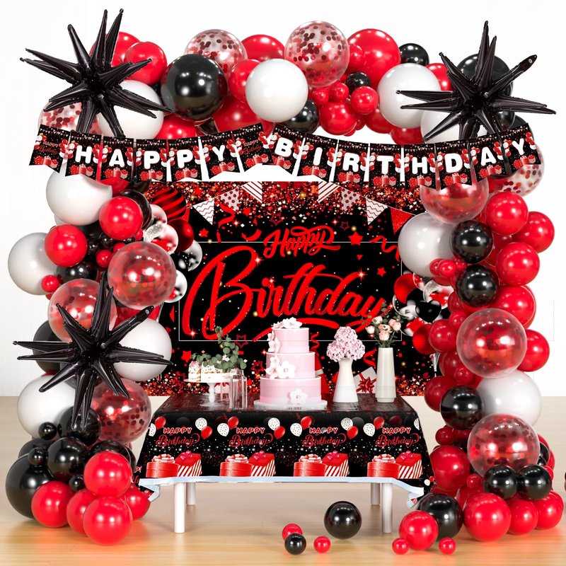 - Red and Black Birthday Party Decoration Supplies - Come with 110pcs red black and white confetti balloons garland arch kit, 3pcs foil star balloons,1pcs happy birthday backdrop, 1pcs happy birthday banner, 1pcs happy birthday tablecloth, 4pcs balloons tools.