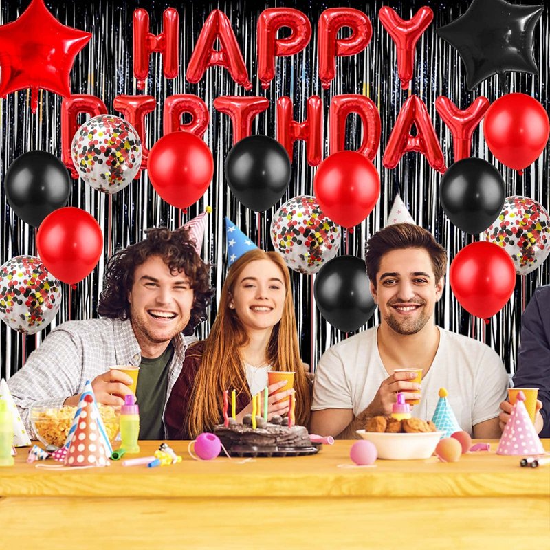 Red Black Birthday Party Decoration Kit - Happy Birthday Banner,Fringed Curtain,Latex Balloon and Confetti Balloons for Girls and Womens Birthday Party Supplies