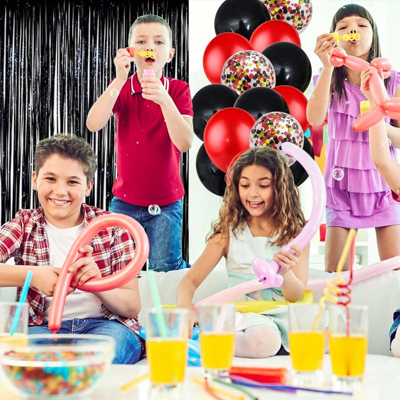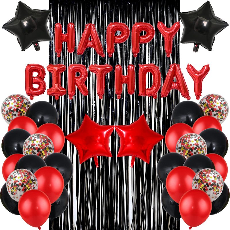 - Packing: 16inch black happy birthday banner,red fringed curtain,2pcs 18inch black pentagram balloons,2pcs 18inch red pentagram balloons,10pcs 12inch red balloons,10pcs 12inch black balloons,10pcs 12inch red and black confetti balloons,Balloon Ribbon 2 rolls.