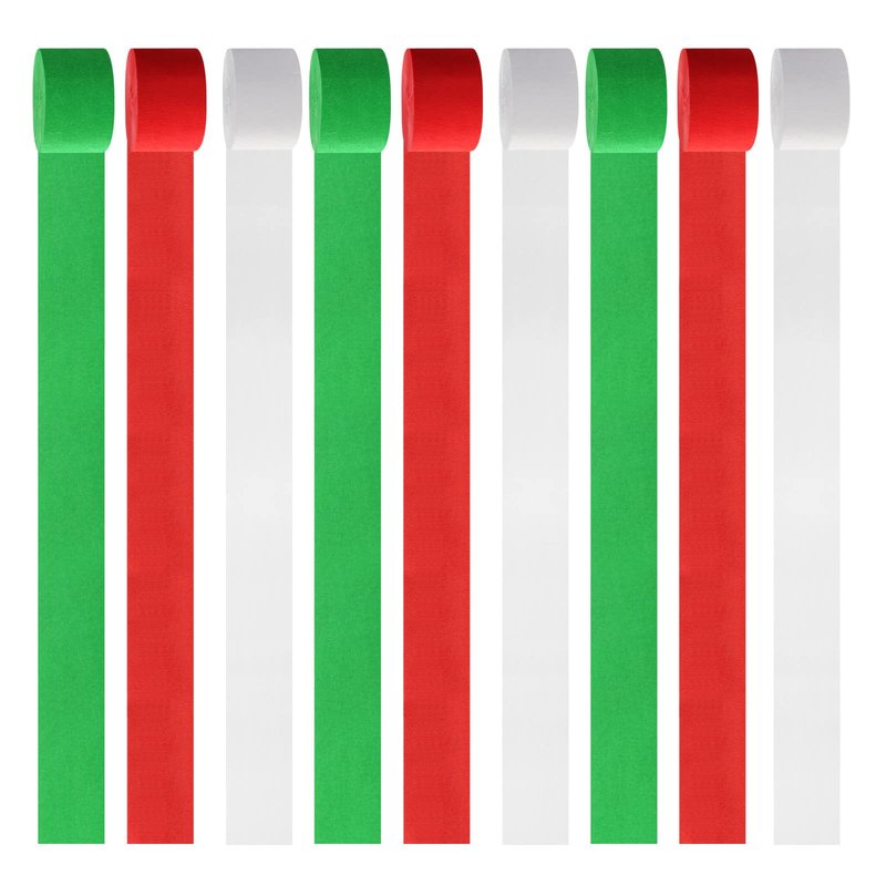 【Package Contains】The sets include 9 rolls crepe paper streamers.The size of each streamer is 1.77inch*82ft.They can be easily cut to your length you want. 【Bright color】 Our crepe paper is available in 3 colors, 3 rolls per color:red green white.There is plenty of each color to really get creative and have some fun. 【Widely Used】They are perfect for bridal shower, birthday party,baby shower decorations,weddings,christmasdecorations,christmas party decorations,birthday decorations, wedding,mexican decorations for party,italian party decorations. 【Resistant to fade】 The paper material of the streamers decorations high quality, recyclable and eco-Friendly,the color is not easy to fade,easy to make twisted streamer backdrops. 【100% Satisfaction Guarantee】You can get a refund unconditionally if you are not satisfied with our products , do not hesitate to contact us if you have any questions.