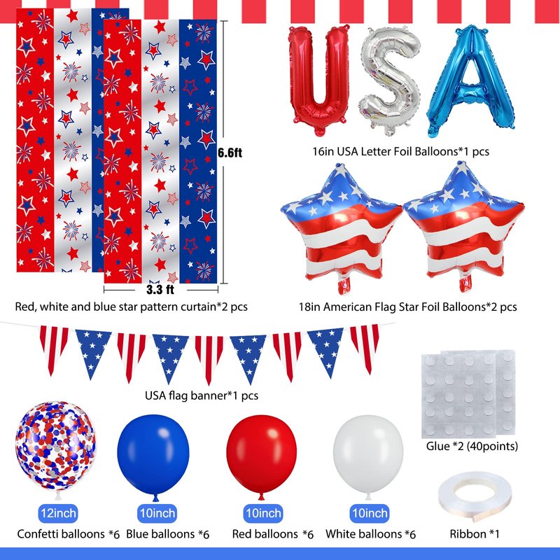 - Package - You will get 2 pack foil fringe curtains,24pcs red white blue latex balloon,letter USA,USA flag pennant*1, ribbon*1,point glue*20 . The fringe curtains size (width x drop):3.28 x 6.56 ft each, wonderful patriotic party decoration backdrop curtain