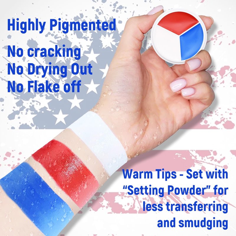 - USA Flag Face Paint - With its vibrant red, white, and blue colors, this face and body paint palette allows you to effortlessly create stunning American flag designs, making it the perfect choice for showcasing your patriotic spirit during America's most important events like 4th of July, Independence Day, Veterans Day, and more. Stand out from the crowd with your patriotic face paint.