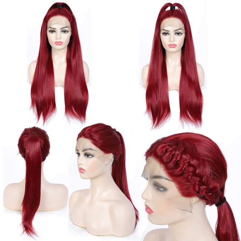 Red Wig for Women Long Burgundy Silky Straight Soft Heat Resistant Lace Front Wigs with Baby Hair Fashion Glueless Natural Hairline Synthetic Hair Wig Halloween Cosplay Costume Wig 24 Inches