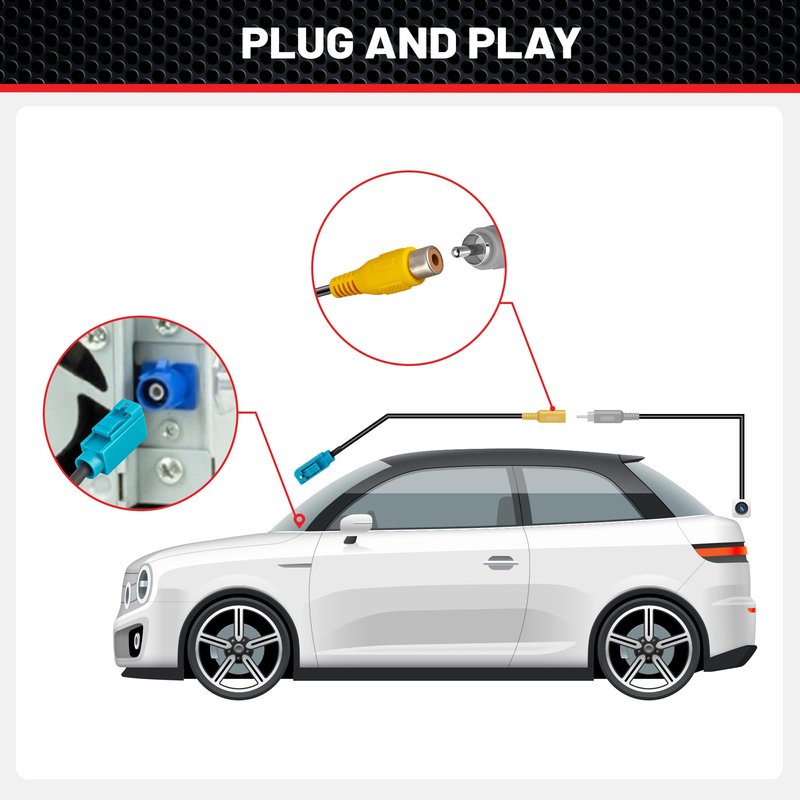 - Plug and play. Extremely easy to install, without cutting any OEM wiring harness. Fakra Z connector is connected to the navigation system, then is simply the video signal via RCA input. A length of 30cm (11.8”)is enough to connect them.