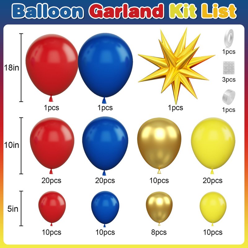 - 【Balloon Set Contents】Red yellow blue balloon arch kit includes: 31 red balloons, 31 blue balloons, 30 yellow balloons, 18 metallic gold balloons, 1 gold star foil balloons, 5m balloon chain, balloon dispensing glue, 10m balloon ribbon.