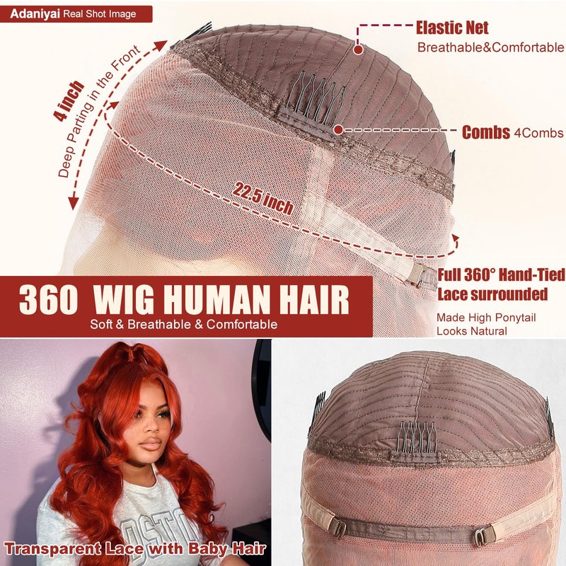 - 【Colored Lace Front Wigs Human Hair Pre Plucked Cap】The Deep Ginger Red Human Hair Lace Front Wigs Average Cap (21.5-23.5inch Circumference Size), Medium Cap With 4 Combs And Adjustable Strap, Perfectly Combined With Your Head. 360 Wig Soft, Breathable, Healthy, Comfortable. Auburn Color Human Hair Lace Front Wigs, Friendly to Beginners. asy to Install and Take Off.
