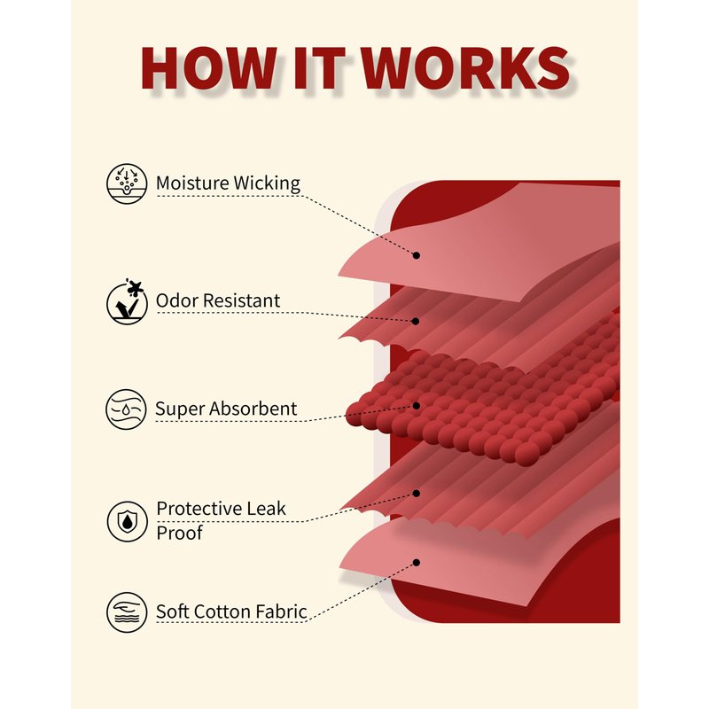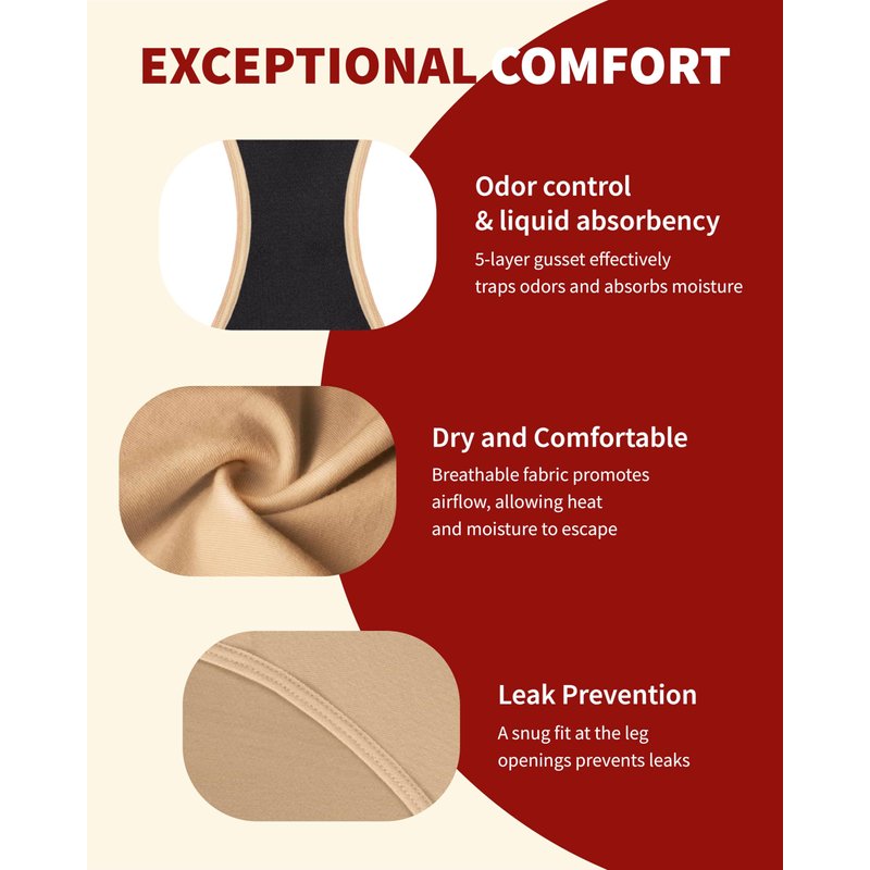 - Five-Layer System: These protective underwear for women typically features multiple sections made from materials for optimal performance. The five-layer structure is aimed at absorbing urine, keeping the skin dry, neutralizing odors, and avoiding leaks