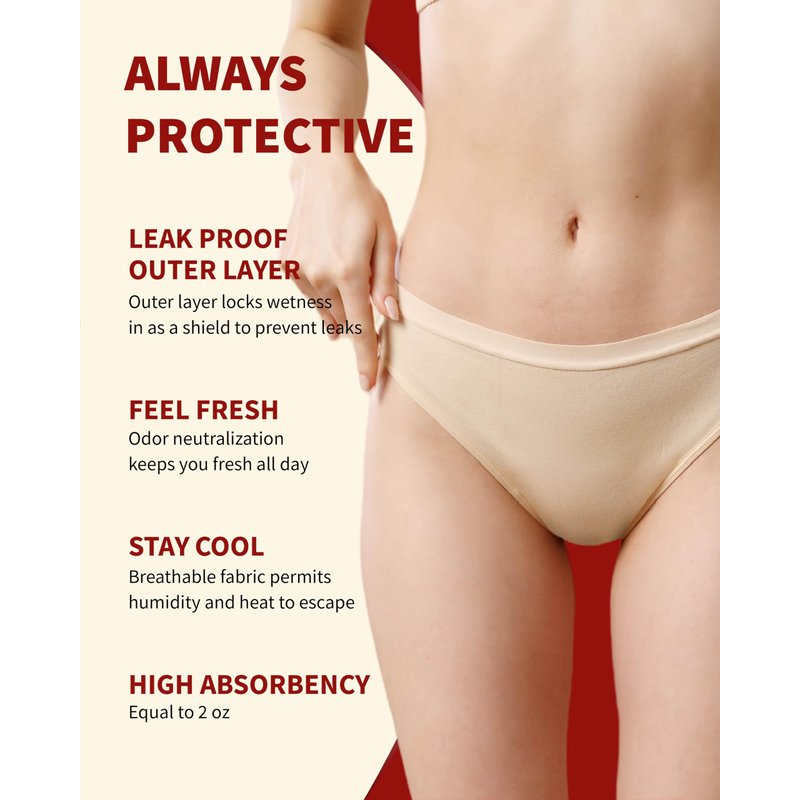 - Absorbent Core: The core with absorbency effectively collects and locks in the fluid, preventing any leaks. This absorbent underwear for women is capable of holding a 2 oz amount of liquid, ensuring the wearer stays free from wetness throughout the day