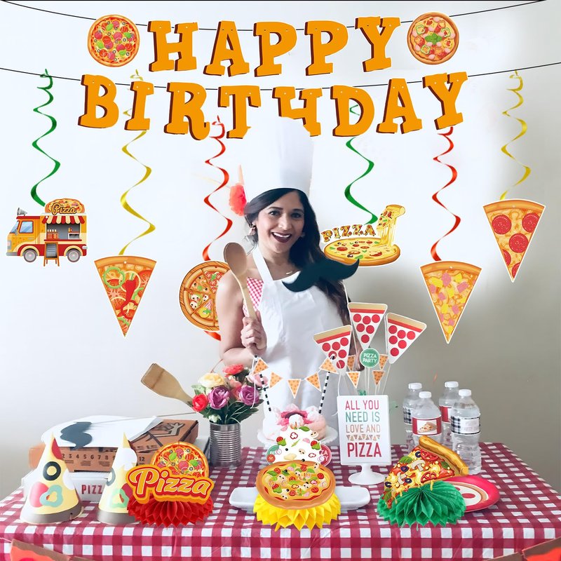 Refavor Pizza Party Decorations - 11PCS Pizza Birthday Party Decorations Pizza Happy Birthday Banners Hanging Swirl Pizza Theme Honeycomb Centerpieces Table Decor Supplies Pizza Decorations for Party