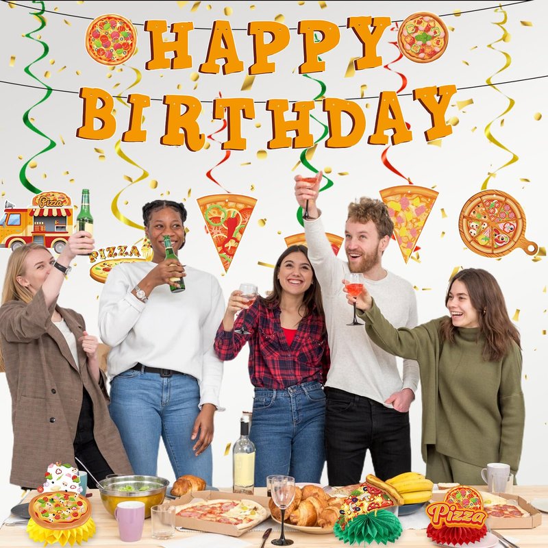 You will receive 12 pieces of pizza-themed birthday party decorations, including 3pcs birthday banners, 6pcs pizza ceiling decorations, 3pcs honeycomb center decorations.
