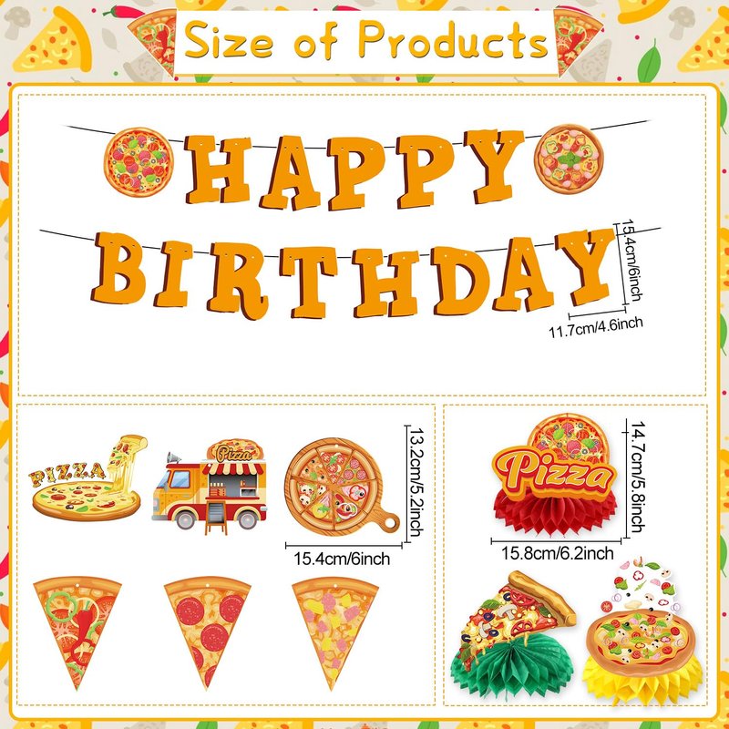 - Pizza Birthday Party: You will receive 11 pieces of pizza-themed birthday party decorations, including 2pcs birthday banners, 6pcs pizza ceiling decorations, 3pcs honeycomb center decorations, sufficient quantity and rich types.