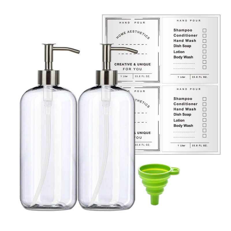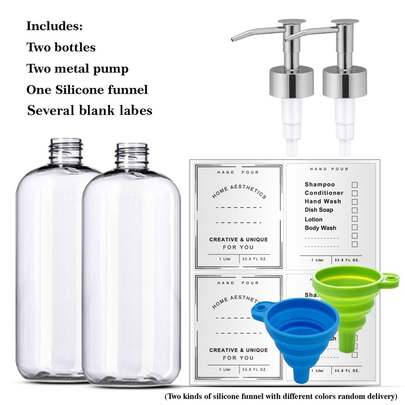 Refillable 32oz Dispenser Plastic Bottle 2pack with Steel Pumps, 1 Liter Crystal Clear Multi-Use Empty Container with Funnel for Shampoo, Conditioner, Body Wash, Liquid Hand Soap, Lotion