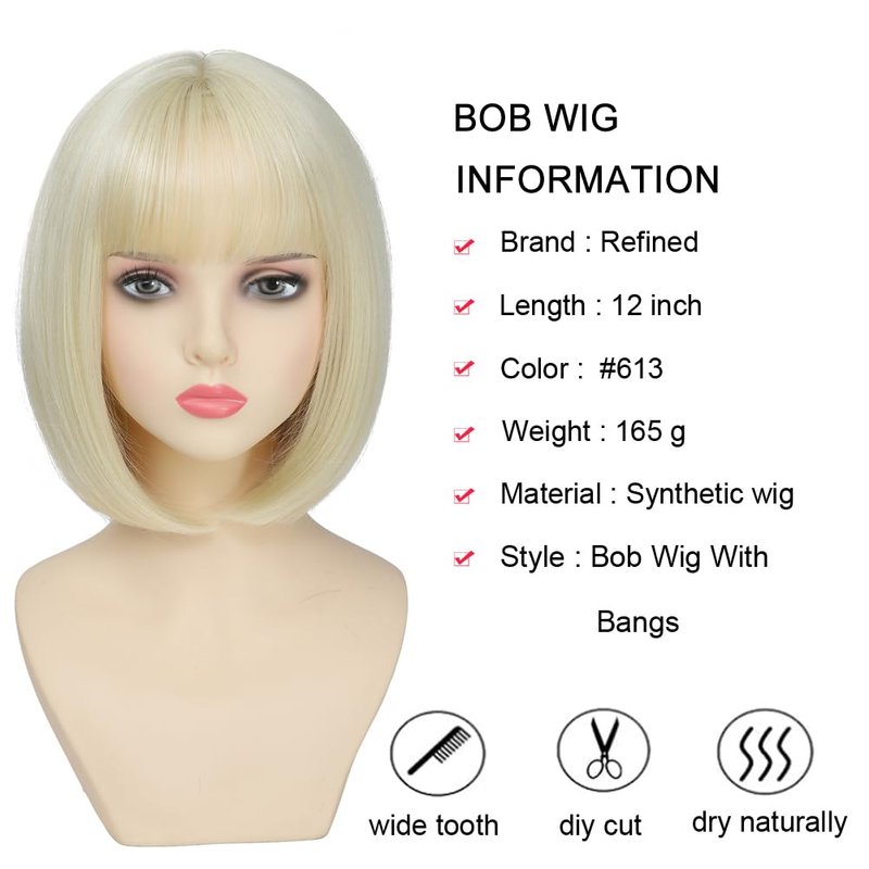 Refined Short Bob Wigs With Bangs 12 inch Straight Synthetic Cosplay Party Wig For Women Daily Use Colorful Hair Wigs (#613, 12 Inch)