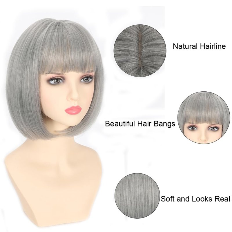 Refined Short Bob Wigs With Bangs 12 inch Straight Synthetic Cosplay Party Wig For Women Daily Use Colorful Hair Wigs (Grey, 12 Inch)