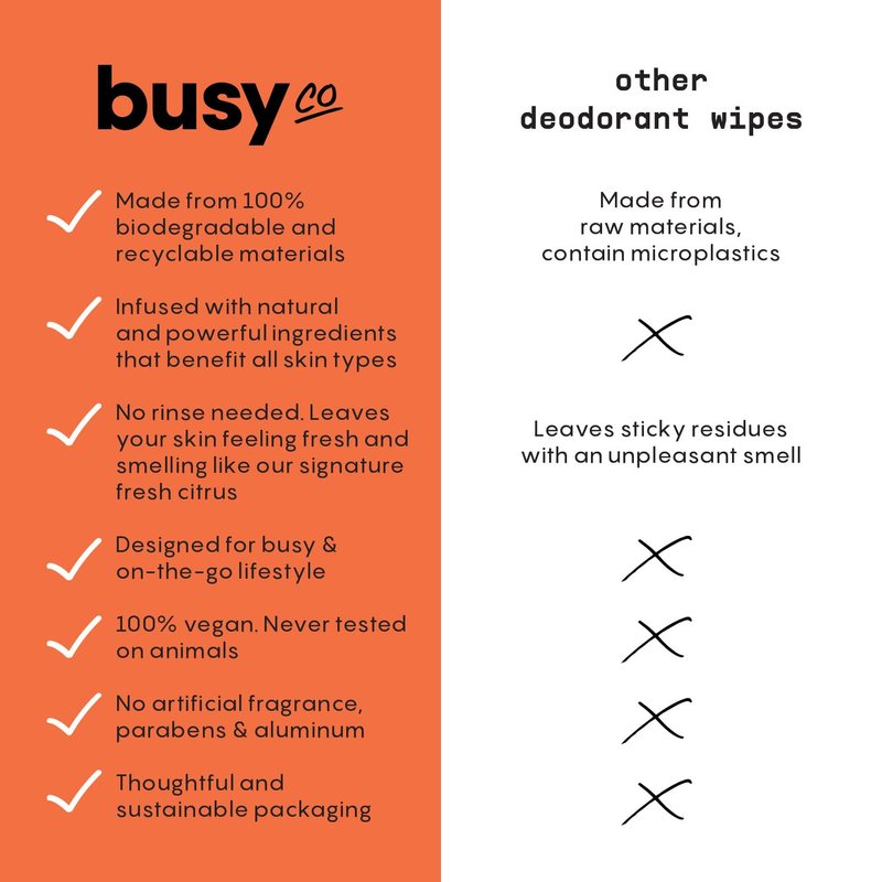 - THE ZERO WASTE DEODORANT WIPES FOR ADULTS - Our Deodorant wipes are completely organic made from sustainably produced materials and packed with pure, high-quality ingredients your skin will love. The wipes are produced by factories that rely entirely on wind power unlike ordinary wet wipes individually wrapped