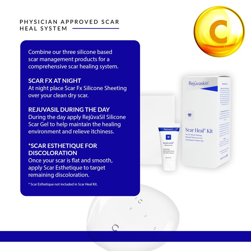 Rejuvaskin Scar Heal kit is made with the highest quality ingredients and to the highest specifications to achieve the maximum result for patients seeking to manage new and old scars. 100% Medical Grade Silicone Durable (30-45 days use) Naturally self-adhesive Scar Fx is used to improve the appearance of surgical and traumatic scars (including normal post-op scars, hypertrophic scars, and keloid scars) and burns. Scar Fx is applied to a clean and dry scar, for up to 8-12 hours nightly, and can be secured to the skin with medical tape as needed. Scar Fx creates an occlusive barrier promoting skin moisture. This barrier supports the mechanism of action, which includes hydration and occlusion. Scar Fx Silicone Sheeting's regimen was designed to maximize compliance and results. Scar Fx is applied in the evening and overnight worn while sleeping. In the morning, the reusable sheeting is removed and the process is repeated. Rejuvaskin also has RejuvaSil Silicone Scar Gel, Scar Esthetique Scar Creme, and Scar Heal Kits which provide around the clock coverage for your scar.