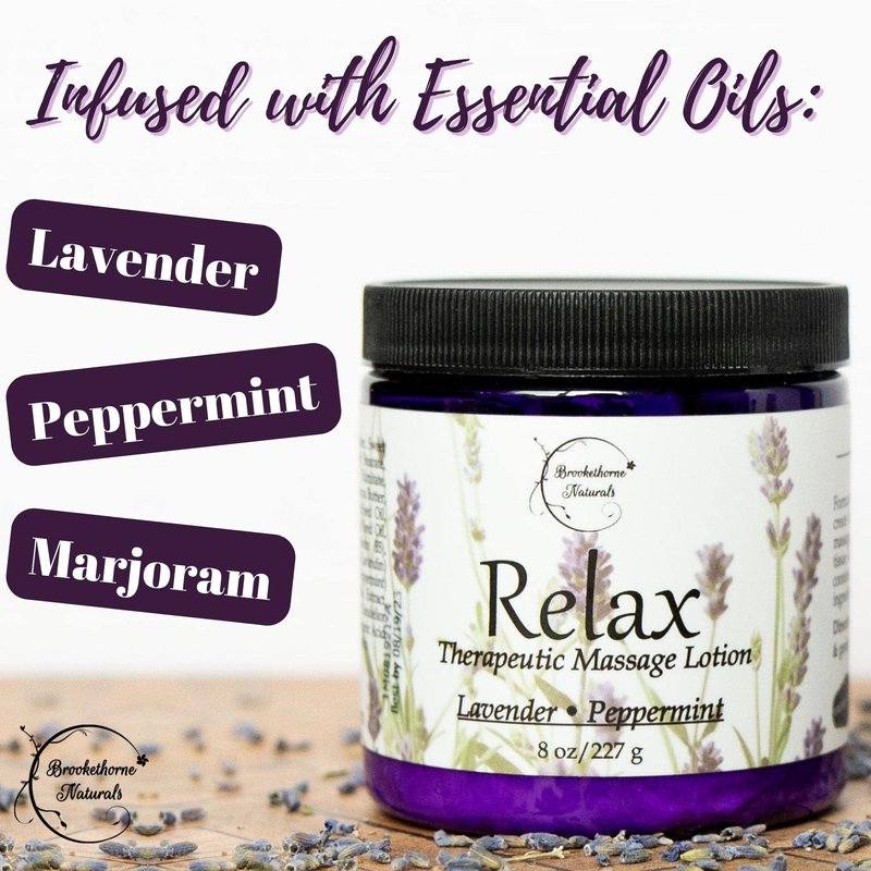 Relax Therapeutic Massage Lotion – All Natural Enriched with Lavender & Peppermint Essential Oils Perfect for Massage Therapy - Massage Cream for Full Body Massage - Brookethorne Naturals 8oz