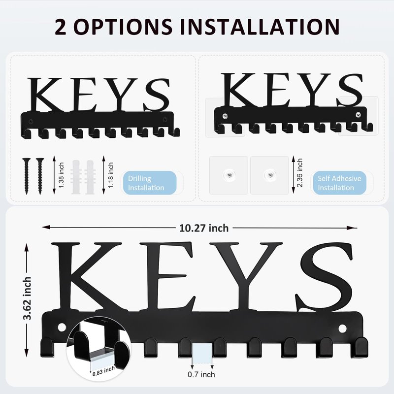 - 2 Installation Ways: Metal key holder is equipped with 2 pcs of nail free stickers and 2 sets of screw accessories, just choose a suitable installation method you want. Drilling installation is suit for heavier and more stable hanging, self adhesive installation is suit for clean and smooth surfaces.