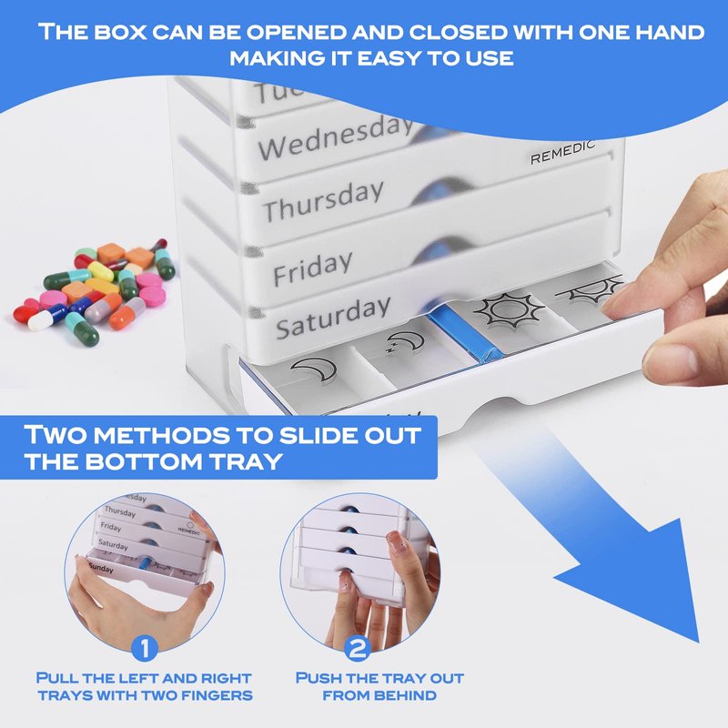 Remedic Weekly Pill Organizer – Better Grip Design Pillbox - Arthritis and Senior Living aids -7 Day Trays with 4 Compartments Each for Accurate Medication Planning. AM/PM Medication Reminder
