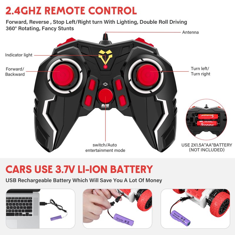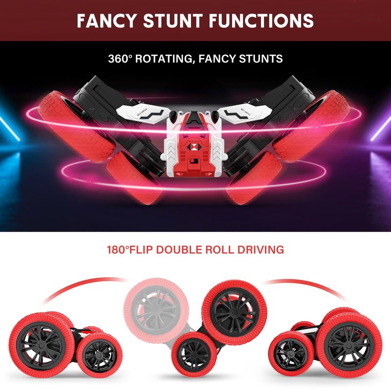 - RC STUNT CAR: 360-Degree rotation on dual-sides, race to drift and flip the RC car all around. This RC stunt car for kids will spin like a crazy cyclone with cool lighting effects. You can control the RC cars in any direction with its remote controller.