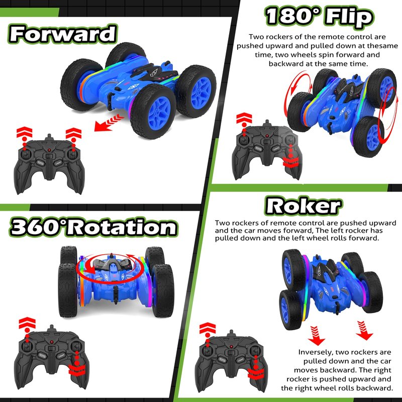 - RC STUNT CAR WITH COLORFUL STRIP LIGHT: This remote control car has 2 colorful LED strips and 2 headlights that will automatically flash in different colors, which is an awesome RC car toy for kids. Double sides running, moving forward, backward, turning left, right, 360-degree tumbling flip to bring kids a fantastic driving experience.