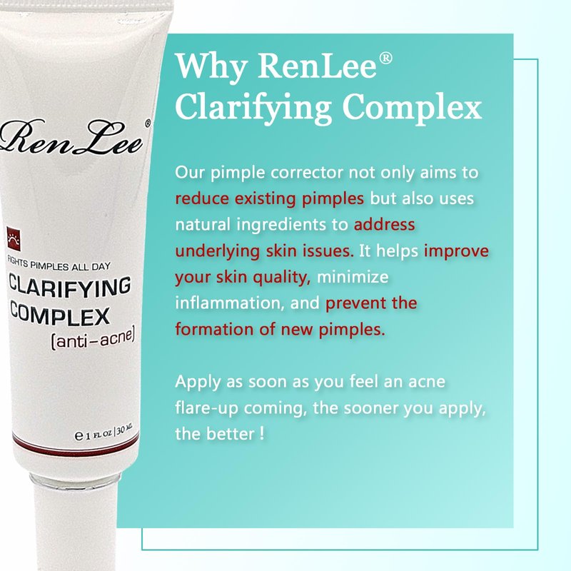 - RENLEE Clarifying Complex (Anti-Acne) helps stop early-stage blemishes, it can penetrate deep under skin to calm and reduce angry pimples without irritating or drying out skin.