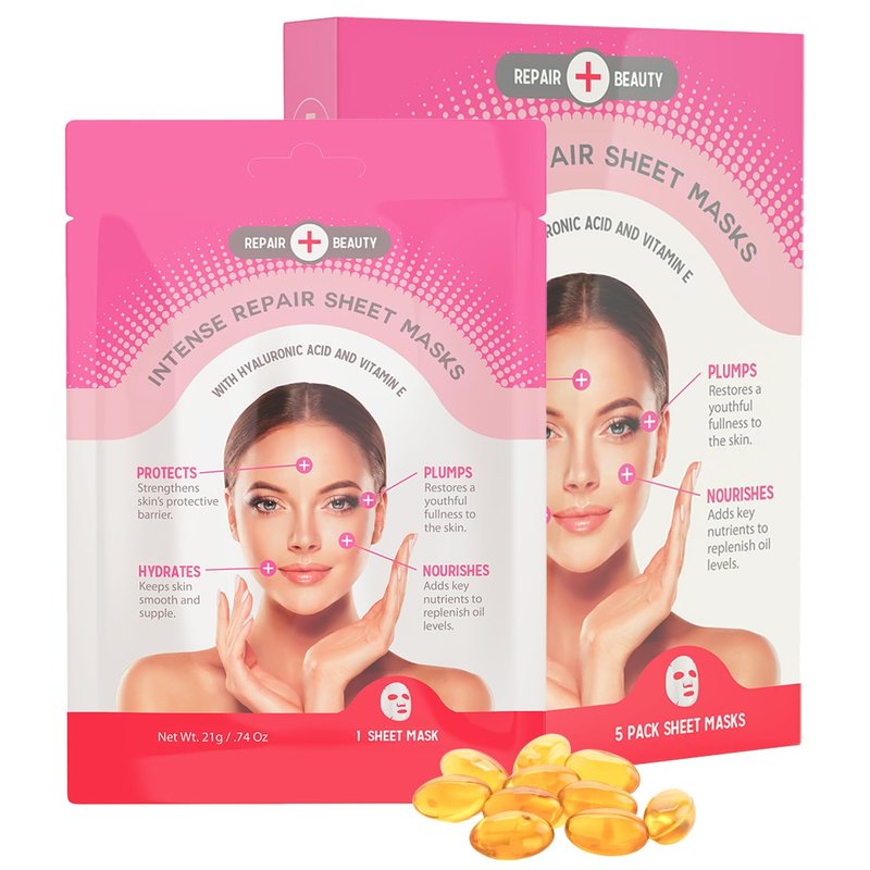 Repair Beauty Hyaluronic Acid & Vitamin E Sheet Face Mask - Plumps & Moisturizes Skin, Reduces Wrinkles & Fine Lines, Hydrating Sheet Mask - Cruelty Free Korean Skin Care For All Skin Types - 5 Masks