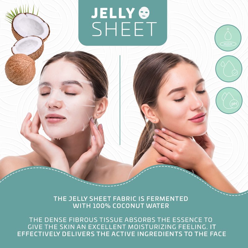 - JELLY SHEET: The jelly sheet fabric is fermented with 100% coconut water. The dense fibrous tissue absorbs the essence to give the skin an excellent moisturizing feeling. It effectively delivers the active ingredients to the face.