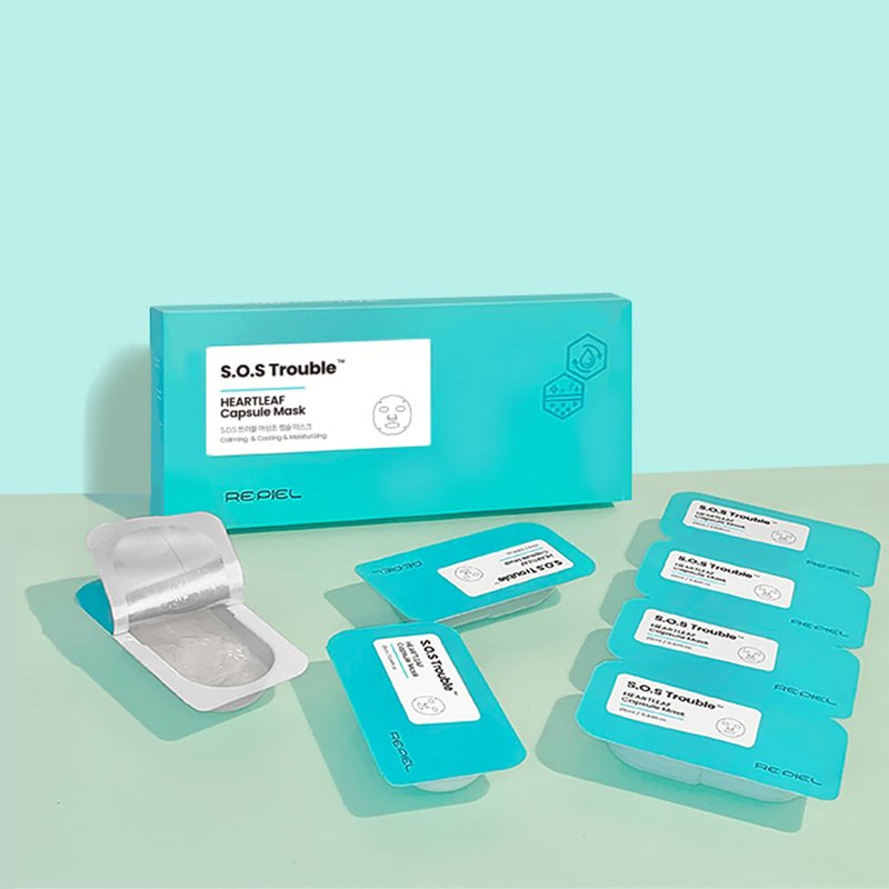 Product Name: RE:PIEL SOS Trouble Heartleaf Capsule Mask / Size: 25ml x 4 sheet mask / How to Use: Grab one capsule, shake the package, and open the capsule. Unravel the rolled sheet and place it on the face around the eyes, nose, and mouth. Leave the mask on for 15 to 20 minutes and after removing the mask, pat the remaining contents gently into the skin. / The SOS Trouble Capsule provides soothing care for acne and is slightly acidic to mimic the skin’s pH. / Ingredients: Water (Aqua), Methylpropanediol, Glycerin, Nacinamide 12-Hexane- diol, Hydroxyacetophenone, Butylene Glycol Panthenol, Carbomer, Polyglycerin-3, Arginine, Dipotassium Glycyrrhizate, Houttuynia Cor- data Extract, Xanthan Gum, Ethylhexylglycerin, PCA, Hamamelis Virginiana (Witch Hazel) Extract, Centella Asiatica Extract, Glycyrrhiza Glabra (Ucorice) Root Extract, Camellia Sinensis Leaf Extract, Glyceryl Acrylate/Acrylic Acid Copolymer, Betula Alba Juice Sodium Hyaluronate PVM/MACopolymer Hydroxypropyltrimonium Hyaluronate Hydrolyzod Hyaluronic Acid Tocopherol Sodium Acetylated Hyaluronate