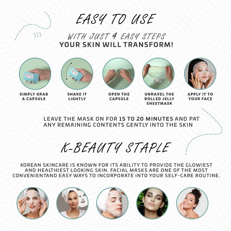 - EASY TO USE: With just 4 easy steps your skin will transform! Simply grab a capsule, shake it lightly, open the capsule and unravel the rolled jelly sheet mask and apply it to your face! Leave the mask on for 15 to 20 minutes and pat any remaining contents gently into the skin