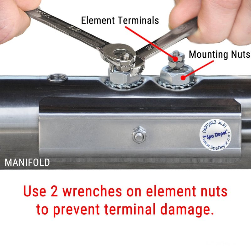 Premium grade flow-through replacement spa heater elements. You cannot buy a better quality hot tub heater element at any price. Fits 2" stainless steel flow thru tube spa heater manifolds including Balboa M-7, Brett Aqualine, and many others. Use 2 wrenches when connecting to avoid damage. Replaces 12-0100-K (5.5kW), 12-0101-K (4.5kW), 12-0102-K (4.0kW), 6-flo, 4-FLO 25-4030, 20-3440, 25-4044.