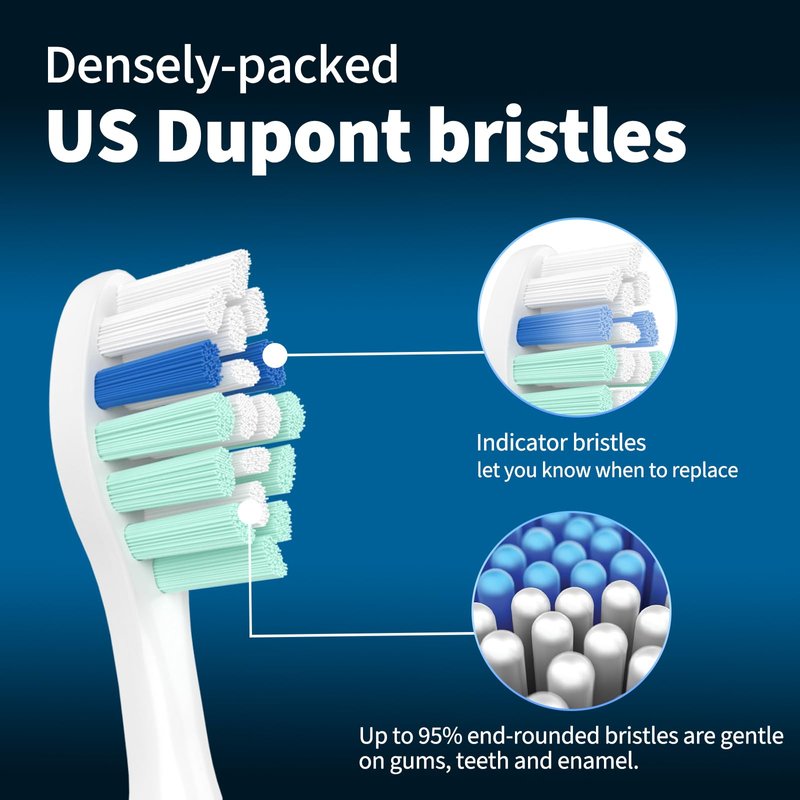 - COMFORTABLE AND GUM HEALTH: Feel the premium DuPont bristles (our bristles are the same as the name brand). These electric toothbrush replacement heads for Philips Sonicare feature the Higher Ratio DuPont End-Rounded bristles which achieves an optimal balance of cleaning and gentleness, preventing irritation and making you feel more comfortable brushing experience