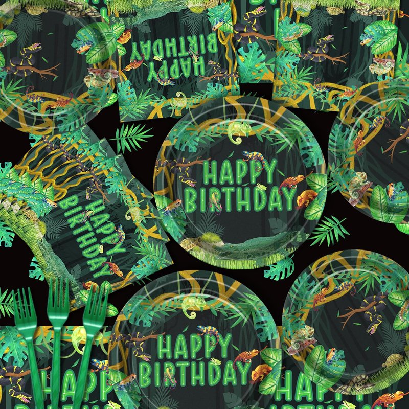 - More Time to Party: Just spread the reptile birthday party tablecloth on the table to protect your table from stains and scratches. Using these jungle swamp wilderness party supplies, you can simply dispose of them after the party. Spend more time celebrating a party, instead of cleaning up!
