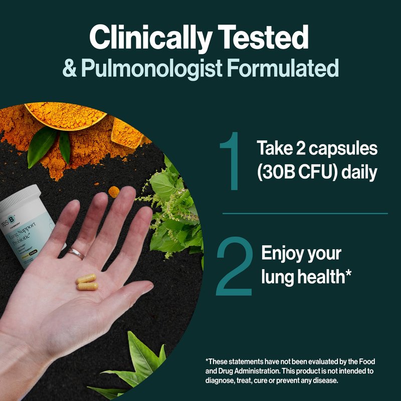 Introducing a natural, holistic, and science-backed solution for respiratory wellness: whether you're looking for an immune booster or a respiratory refresh. ResBiotic's resB Lung Support is a natural lactobacillus probiotic for better lungs, gut, and immune health. It contains a multi-strain probiotic blend of live cultures with ayurvedic herbs for digestive, respiratory, and immune system optimization! Our doctor-developed, clinically-studied blend is precision blended for optimal lung support. The active ingredients work synergistically to help clear your airways while bolstering the function and structure of your lungs. Formulated with L. Acidophilus and L. Rhamnosus, this great probiotic directly benefits your gut microbiome and digestive system as well! Holy Basil leaf and Turmeric extract help bolster your immune defense, so you can stay fit and active all the time. Breathe easy with resB Lung Support!