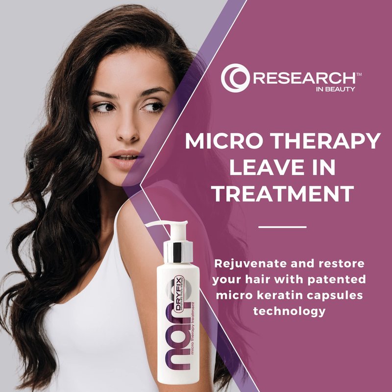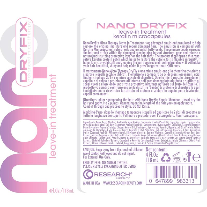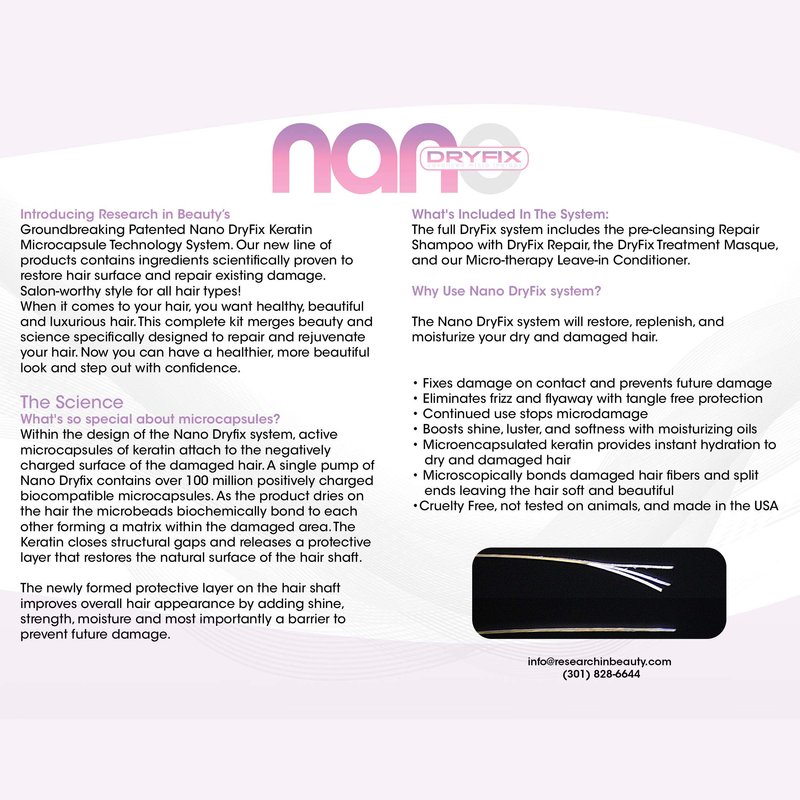 Research In Beauty has created a groundbreaking Patented Nano DryFix Keratin Microcapsule Technology System used in the new Nano DryFix hair repair treatment for damaged hair - This new line of products contains ingredients scientifically proven to restore hair surface and repair existing damage. Salon-worthy style for all hair types! When it comes to your hair, you want healthy, beautiful, luxurious hair. This line merges beauty and science; specifically designed to repair and rejuvenate your hair. Now you can have healthier, more beautiful hair and step out with confidence. The Nano DryFix system will restore, replenish, and moisturize dry and damaged hair. - Fixes damage on contact and prevents future damage - Flyaway and anti frizz thickening spray with tangle free protection - Stops and prevents microdamage - Microencapsulated keratin provides instant hydration to dry and damaged hair - Microscopically bonds damaged hair fibers and split ends, leaving the hair soft and beautiful - Cruelty free, not tested on animals, and made in the USA Nano DryFix Micro Therapy Leave-In Treatment is an advanced micro therapy emulsion formulated to help restore the original moisture of your hair and repair damaged hair. The bond repair hair treatment emulsion is comprised with Keratin Microcapsules, natural oils and essential fatty acids. Those micro capsules surround the hair and attach within the damaged area helping to seal structural gaps and release a natural moisturizing protective layer as a hair shield. The product then forms a thin reparative keratin protein patch which helps to restore the cuticle to its flexible integrity. It helps to weld split ends leaving the hair repaired and feeling brand new. This extremely damaged hair treatment is also ideal for after sun care and can shield your hair from future environmental damage. It will make your hair beautiful, shiny and help make it grow longer without split ends.