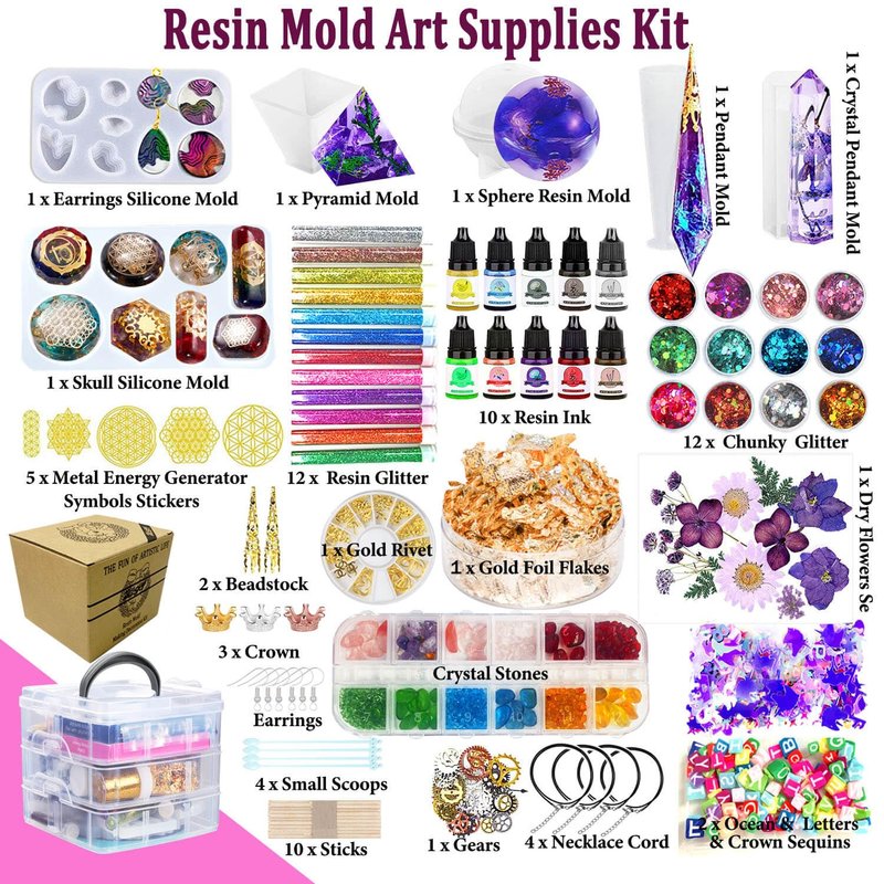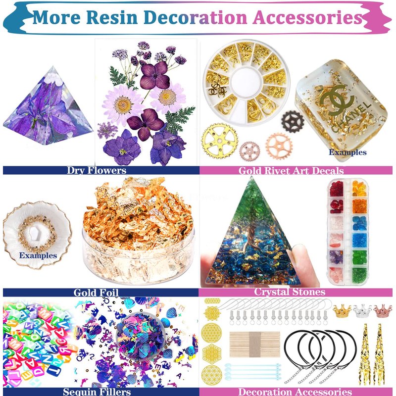 - 【ALL IN ONE PACKAGE】 The accessories in your epoxy resin mold kit contains 14 resin glitter, 12 color resin ink, 12 chunky glitter and gold/silver foil, 6 color of crystal stones, 3 crown,1 box gold foil, 1 box gold rivet art decals, 1 bag wheel gear, 1 dry flowers set, 1 bag pearls, 1 bag earring hooks, 4 waxed necklace cord, 1 orgone Chakra Patch art decals, 2 metal bead caps, 2 bags sweet wrapper,4 spoon, 10 wooden sticks,1 tweezer.
