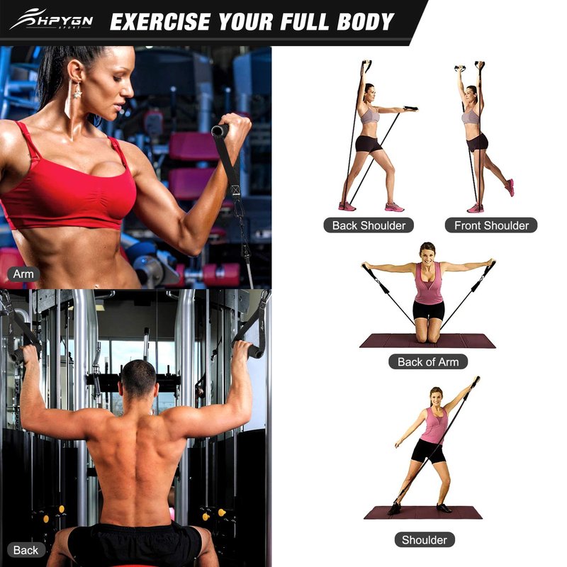 ?The HPYGN Resistance Bands Set are ideal for Strength training Physical therapy Home workouts Body shaping Weight loss. YOUR PERSONAL HOME GYM – Got no time to head down to your local gym every day? With this set of resistance bands, you can enjoy a full body workout without even stepping out of your home. TRAIN DIFFERENT MUSCLE GROUPS – Use these fitness bands to perform rows, pulls, raises, and fly workout sets to exercise your arms, back, hips, legs, chest, and abdominal region. You can use resistance bands to replace dumbbells or weights. New upgrade Strong rubber bands provide consistent resistance for every movement and give you enough flexibility to do hundreds of different exercises from beginner level through advanced. Virtually guarantees you'll never grow bored of your workouts. The Resistance Bands Set can be integrated seamlessly to improve your muscular endurance, strength, balance, flexibility, body awareness and co-ordination. Apart from body building and fat burning, the fitness set is also useful for injury rehabilitation, perfect for beginners to experts. The foam handles are made of anti-slip, sweat absorbing material for a comfortable frip. The door anchor turns your door into your own gym in seconds. At compact package size and light weight, the workout set will surely be a convenience and guarantee a much more interesting trip. 100 percent Satisfaction! HPYGN Insanity Resistance Bands are built to last with high-quality materials and attention to detail and safety that exceeds market standards. Should your bands ever break, we’ll replace them for you at no cost to you.
