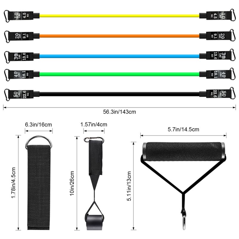 - 【12pcs in one set】: 5pcs different resistance bands[ Black (50lbs) > Green (40lbs) > Blue (30lbs) > Orange (20lbs) > Yellow (10lbs)], 2pcs anti-slip handles, 1pcs premium door anchor, 2pcs ankle straps,1pcs workout guide and 1pcs carry gift bag, you can have all in one set, easy to train, easy to carry for travelling.