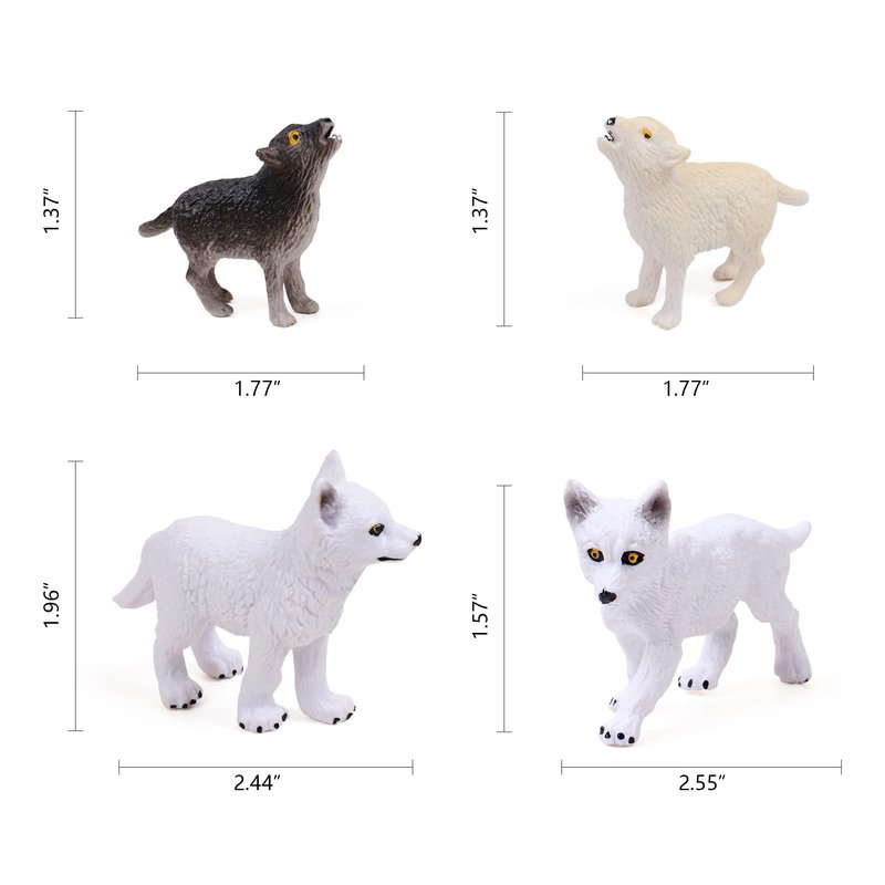 - 8pcs Wolf Cub Toy Figures Set includes: 1 Grey Standing Wolf Cub , 1 Grey Walking Wolf Cub , 1 Grey Howling Wolf Cub,1 White Standing Wolf Cub , 1 White Walking Wolf Cub, 1 Arctic Standing Wolf Cub, 1 Arctic Walking Wolf Cub , 1 Arctic Howling Wolf Cub.