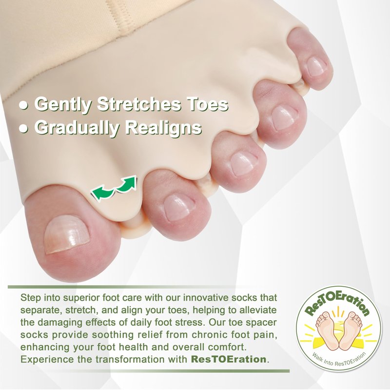 - Introducing ResTOEration, our innovative toe spacer socks! They are created with a unique blend of silicone and soft elastic fabric for superior comfort and durability. Meticulously crafted material ensures a comfortable walking experience at home.