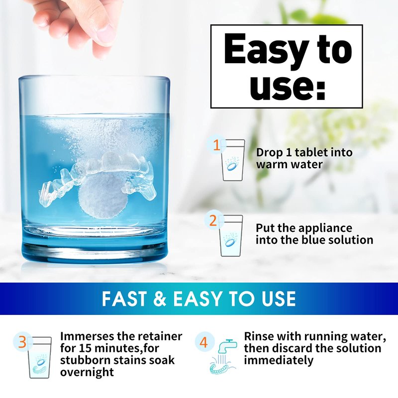 - QUCIK DISSOLVE: Our cleaning tablets adopt Reactive Oxygen Micromolecular Osmosis Technology, provide comprehensive cleaning and deep desccaling for your retainers, dentures or other dental appliances with no harm